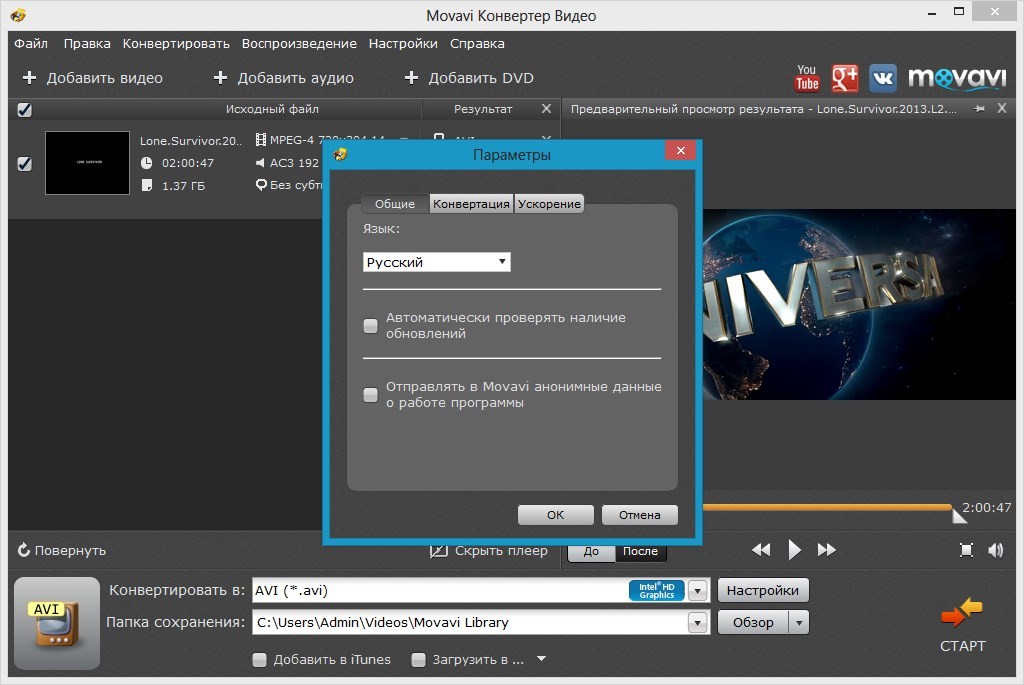 Благодаря переносу значительной части конвертации на видеокарту, смена формата даже у тяжелого видео не займет много времени. Так, в зависимости от “начинки” вашего компьютера, будет возможно включить одно из ускорений: