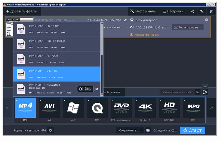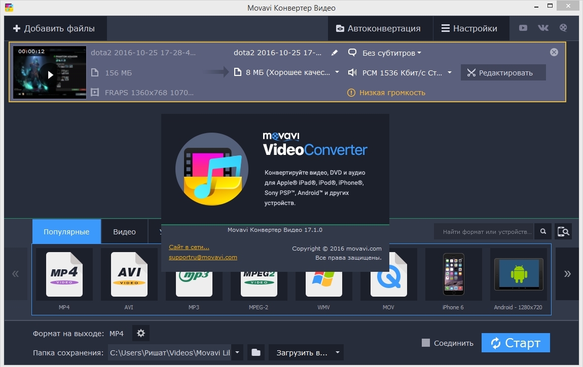 Здесь есть нюансы. Для разных целей могут потребоваться файлы разных форматов. Но не пугайтесь, у Movavi весьма дружелюбный интерфейс поэтому в ней легко разберется любой пользователь. Если сомневаетесь с выбором, то используйте один из предложенных программой вариантов. Например, конвертация в DVD или WEB совместимый формат.