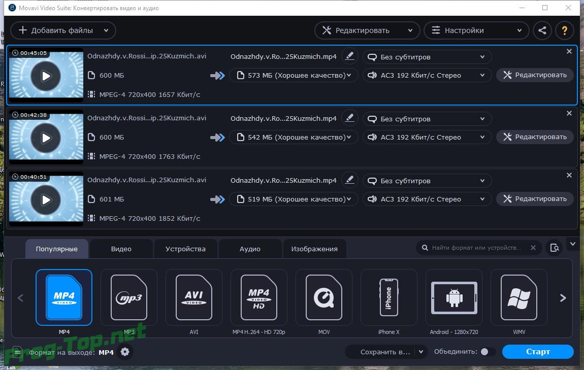 Перед началом конвертации, в правом нижнем углу указываем папку сохранения файлов. Здесь также можно склеить все видео в одно с единым форматом. Нажимаем Старт, и после конвертации проверяем результат в указанной ранее папке назначения.