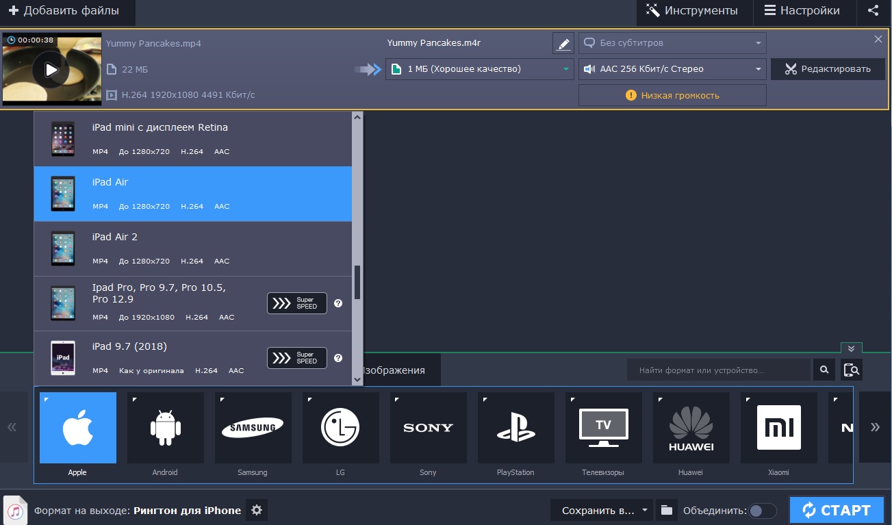 Конвертеры включают предустановки для различных устройств – смартфонов, планшетов, приставок и музыкальных плееров. Среди брендов – Apple, Samsung, Meizu, Xiaomi, Huawei, Lenovo и многие другие. С полным перечнем моделей можно ознакомиться на сайтах программ.