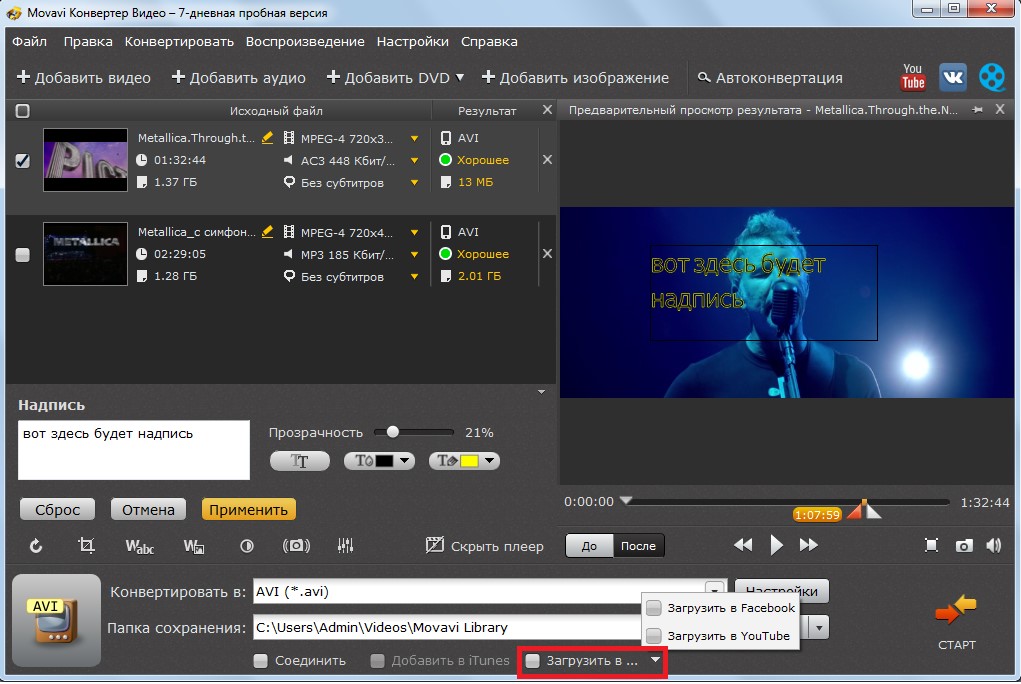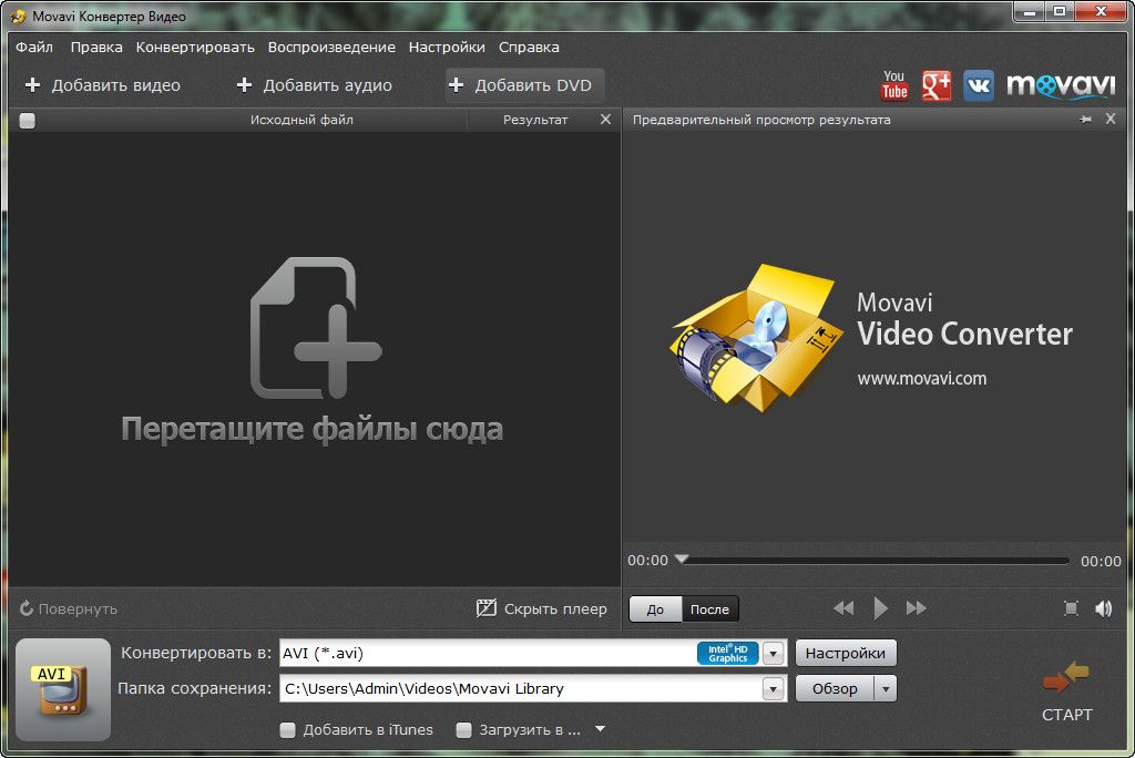Если нужно загрузить видео, аудио или фото сразу в интернет, например, в социальную сеть Вконтакте, Facebook, YouTube или любой другой видеохостинг и сайт то Movavi Video Converter легко может сделать и это. Просто выберите соответствующие настройки или воспользуйтесь готовым набором кнопок на панели управления программой. Это довольно удобно и очень востребовано в условиях современной коммуникации между людьми, когда нужно быстро загрузить тот или иной файл, чтобы поделиться им с Вашей аудиторией.