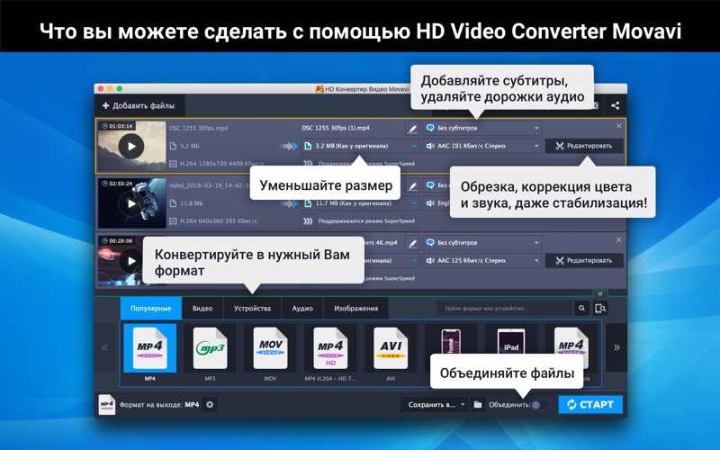 - Можно конвертировать видео с нескольких устройств в один формат. Это может быть полезно, если вы приехали из путешествия и хотите объединить весь видеоматериал, отснятый с разных устройств.