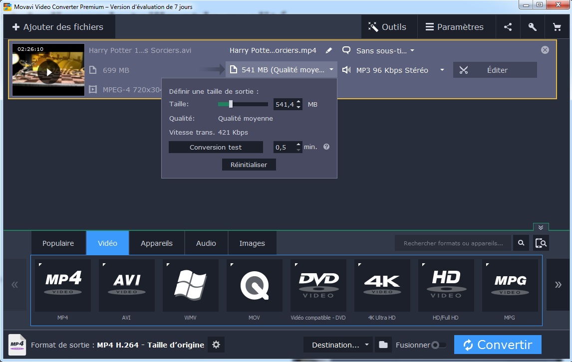Прямо в рабочем окне можно задать размер выходного файла. Это позволит нам контролировать объем и не заполнить слишком много места на диске. Нажимаем на информацию о размере видео. Открывается окошко с настройками, где мы можем указать желаемый размер файла и узнать, в каком качестве он будет конвертирован. Чтобы не прогадать при конвертировании больших файлов, можно воспользоваться пробной конвертацией. Задаем время фрагмента, например, 30 секунд и нажимаем Пробная конвертация.