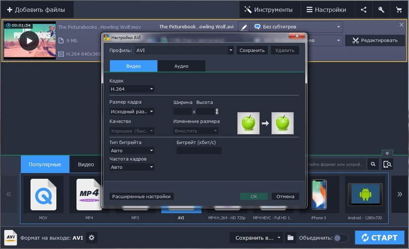 Программы предлагают готовые сценарии конвертации для новичков, а для продвинутых пользователей – возможность настраивать выходные параметры вручную. Вы сможете выбрать формат, установить видео– и аудиокодеки, отрегулировать размер и частоту кадров и оценить качество видеоряда.